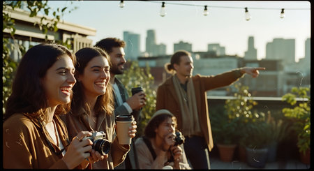 A group of friends stand on a rooftop, smiling and looking out at the city view, with some holding coffee cups and cameras, surrounded by plants and string lights.