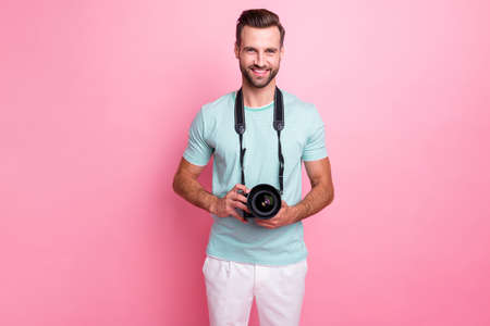 Portrait of charming cheerful man rest relax on summer weekends, hold professional dslr camera wear modern outfit isolated over pastel color background