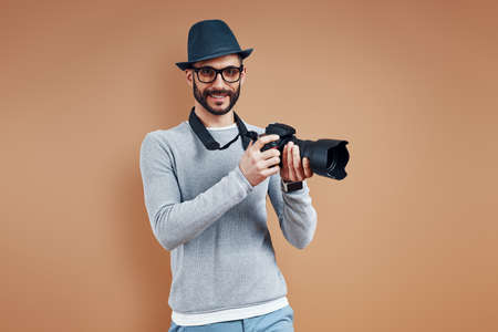 Nice shot. Attractive young man in casual wear is photographing you while standing in studio on a grey background