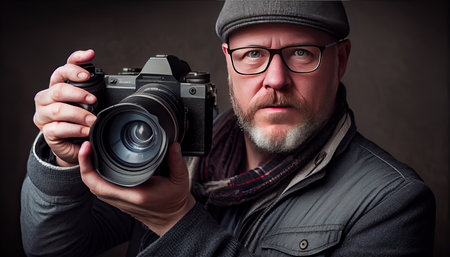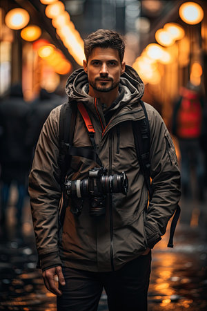 A handsome photographer with a confident gaze holds his camera, ready to create stunning visuals for your project. Perfect for lifestyle, travel, and creative campaigns seeking authenticity.