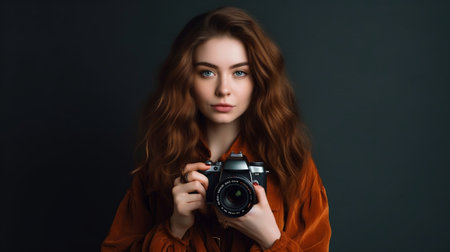World Photography Day. woman holding camera on solid bright background. ai generated