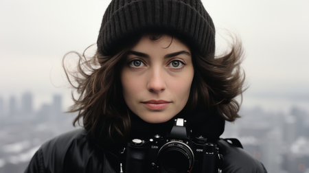 Young female street photographer capturing candid moments in an urban city with camera in hand