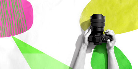 A young female photographer taking a picture with a DSLR camera against a blue background