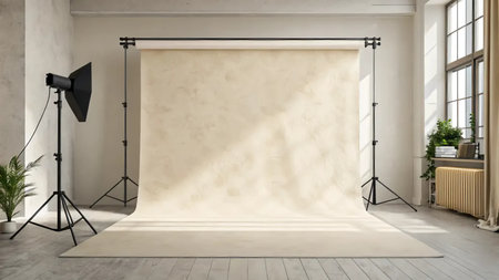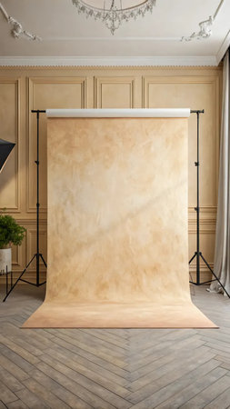 Photo studio with a soft beige canvas on the background of the wall.