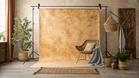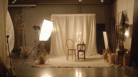 A cozy studio with a photoshoot setup for product marketing. Studio light.