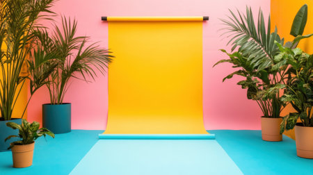 A captivating studio setting featuring a bright yellow backdrop complemented by pink walls and surrounded by lush green plants, perfect for creative photography.
