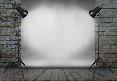 photo studio in old grunge room with brick wall and paper background