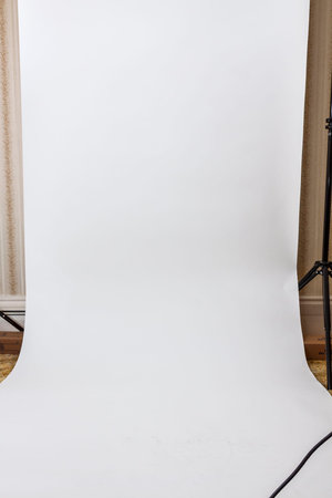 A white backdrop stands ready for a photoshoot in a studio setting