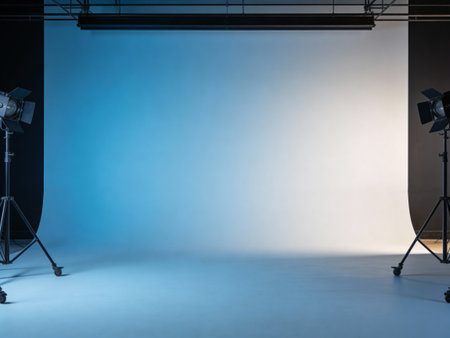 Empty photo studio with lighting equipment and blue wall. 3d rendering
