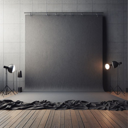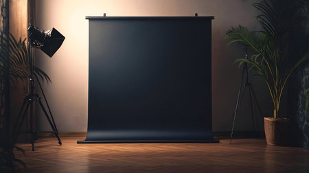 A dark studio setup with a black backdrop, lighting equipment, and plants.