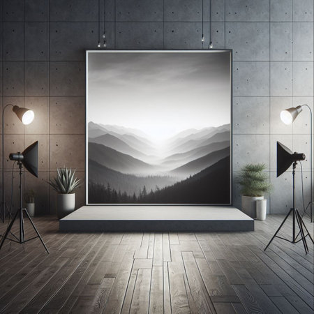 Interior of a modern studio with lighting equipment and mountains in the background