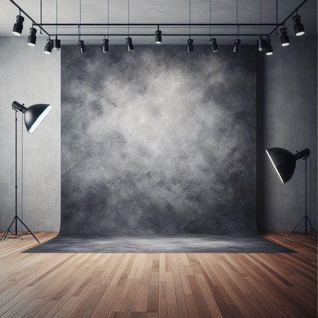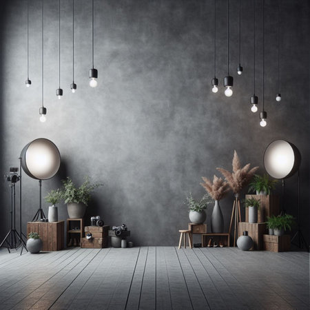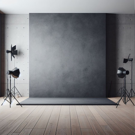 Rustic and Industrial Photography Studio Interior with a Grungy Concrete Wall Backdrop, Loft Architecture, and Professional Lighting Equipment for Creative Photo Shoots and Video Production.