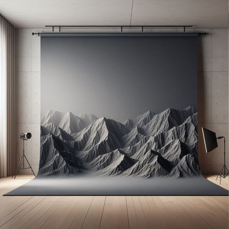 Wide shot of a professional photo studio setup, featuring a large screen displaying a stunning, seamless backdrop of mountains and snow at sunrise, surrounded by softbox lighting. Ideal for virtual production, commercial, and creative concepts.