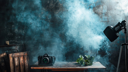 A nostalgic vintage photography setup featuring cameras styled with dramatic smoky effects on a textured dark surface.