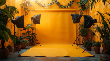 Photo studio with equipment and green plants on the background of yellow wall