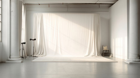 Bright minimalist studio with white walls, a single chair, mirror, and a large black curtain - AI generated