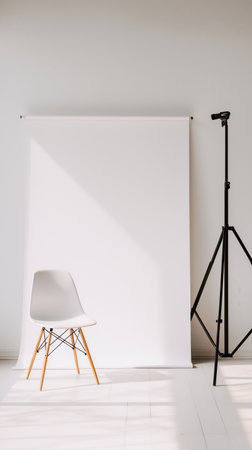 Minimalist photography studio setup featuring a white chair, backdrop, and lighting equipment, creating a clean and modern aesthetic, ideal for product photography or portraits