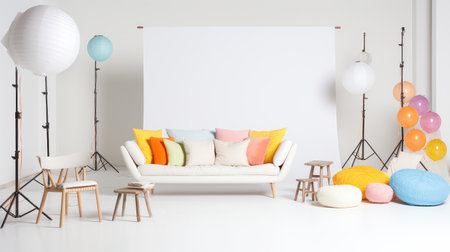 Interior of modern photo studio with empty white poster and equipment. Mock up, 3D Rendering, An empty modern photo studio ready for use, AI Generated