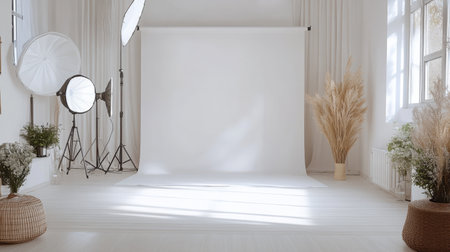A bright and airy photography studio featuring a clean white backdrop, soft natural light, and stylish decor elements. Ideal for professional photographers and creators.