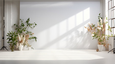 This image showcases an elegant studio backdrop adorned with greenery and soft lighting, ideal for creative photography projects and aesthetic arrangements.