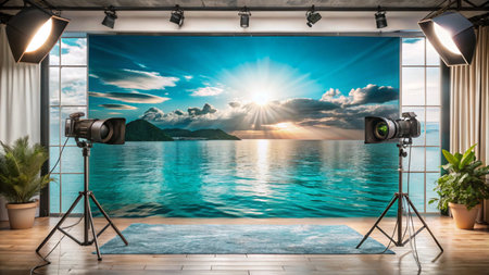Studio with a backdrop of a tropical sunset over the ocean.