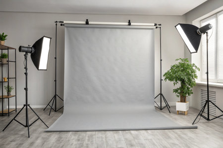 Interior of a modern photo studio with lighting equipment and lighting equipment