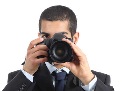 Front view of a professional photographer taking a photograph isolated on a white background