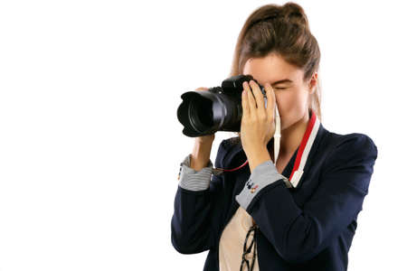 Woman photographer with a DSLR camera isolated on white background