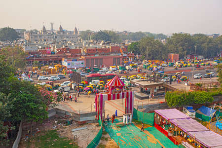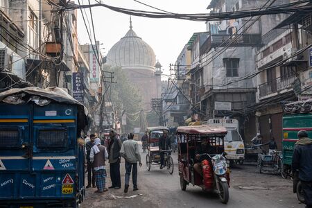 New Delhi, India - November 21, 2019: Busy market streets with colorful houses, buildings and crowds of people, rickshaws near Jama Masjid in Old part of New Delhi, India.