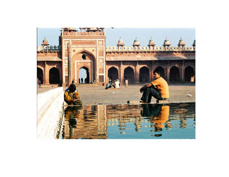 Men in white dresses standing at Isa Khan Niyazi tomb entrance, Humayun
