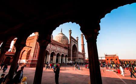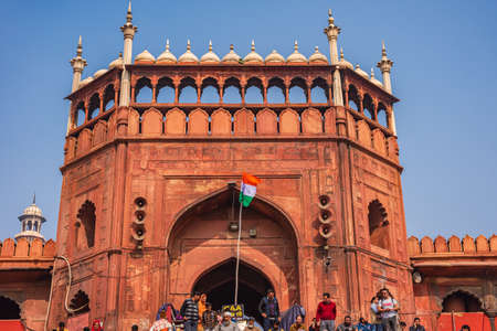 DELHI, INDIA –FEB, 2020: Jama Masjid was originally called Masjid-i-Jahan Numa, 'World-reflecting Mosque', built by Emperor Shah Jahan. It is large mosque constructed with red sandstone, white marble