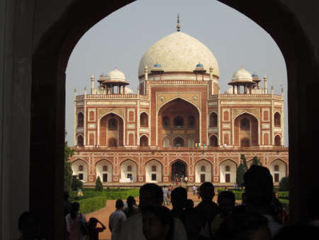 DELHI, INDIA - MARCH 12, 2019: humayuns tomb framed by entrance arch in delhi