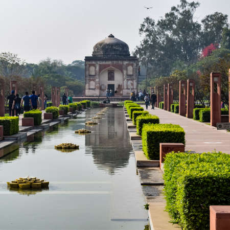 Delhi, India - November 9, 2018: Tourists visiting famous Isa Khan Tomb it is Complex in the Nizamuddin area of Delhi was built in 16th century for Isa Khan Niyazi, a noble in the court of two rulers of the Suri dynasty.
