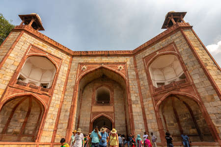 Delhi / India - September 21, 2019: The West Gate public entrance to the Humayun's tomb, the mausoleum of the Mughal Emperor Humayun in Delhi, India