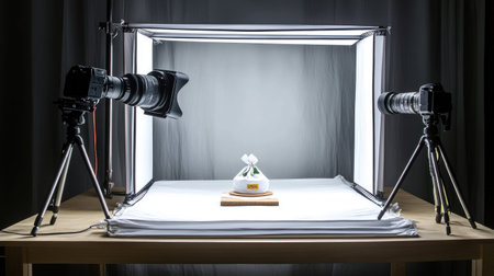 A professional photography setup showcasing a lightbox with product display. Two cameras are positioned on tripods, highlighting the attention to detail in product photography.