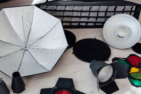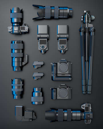 Photographic equipment. Top view of a variety of equipment for the photographer