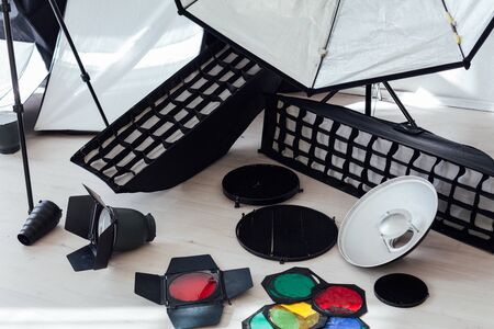 Studio light equipments for photo or film movie video. Light set for professional shooting studio background. LED Flood light and Spot light for video production studio. Setup include Barn door softbox.