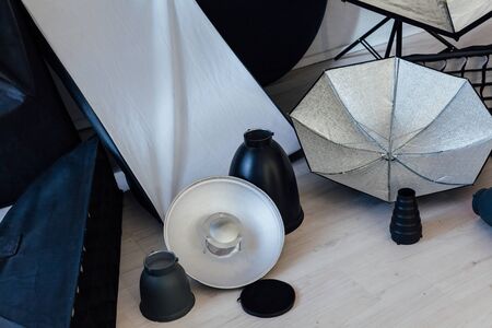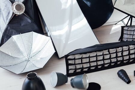 Interior of modern photo studio with white walls, white floor and lighting equipment