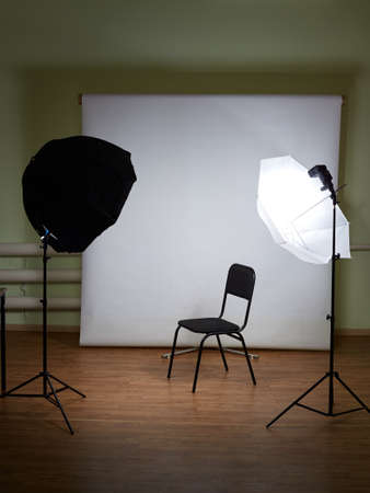 Modern photography studio featuring professional lighting setup and empty chairs, perfect for capturing stunning visuals in a creative environment.