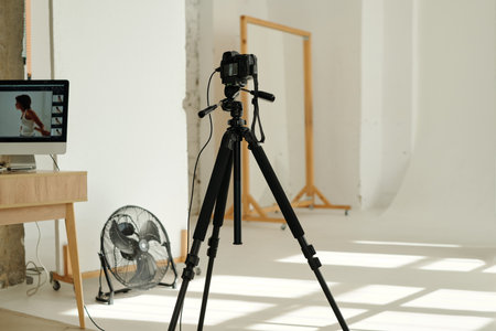 Professional photocamera on tripod standing in the center of spacious modern photo studio with computer on workplace of photographer