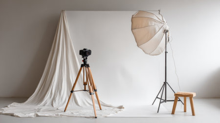 A minimalist photography studio setup featuring a camera on a tripod, soft lighting, a white backdrop, and a wooden stool, ideal for creative photography sessions.