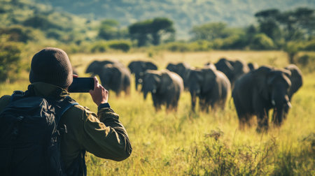 Patient Safari man photographer elephants. Animal trip. Generate AI