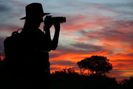 Silhouette of Lady in Safari Dress taking Photographs at Sunset in Africa