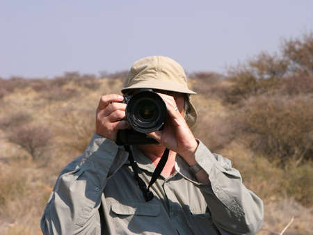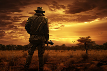 Wildlife photographer capturing moments with a vintage camera while immersed in the vibrant landscapes of an African safari adventure