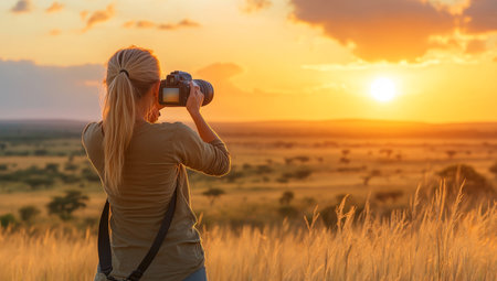 Caucasian woman captures sunset landscape on african safari, embracing nature photography adventure