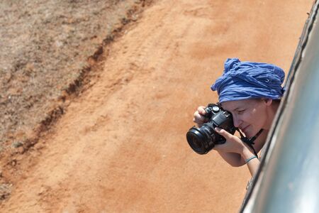 Woman photographer takes a picture from touristic vehicle on tropical on safari in National Nature Park Udawalawe in Sri Lanka