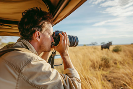 A traveler on a safari jeep, observing wildlife in the African savanna, capturing the thrill of an adventurous expedition.
