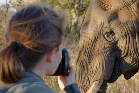 A photographer standing at a safe distance, taking a breathtaking shot of a massive bull elephant in the wild.
