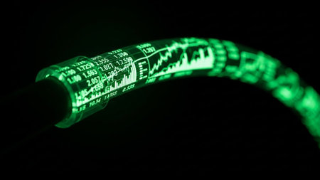 This image showcases a close-up view of a green glowing fiber optic cable. The cable is illuminated with a vibrant green light, creating a striking visual effect. The cable appears to be coiled and features intricate patterns of light, highlighting its structure and the way light travels through it. The background is dark, which accentuates the brightness and clarity of the glowing cable.