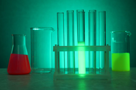 Laboratory glassware with luminous liquids on table against green background